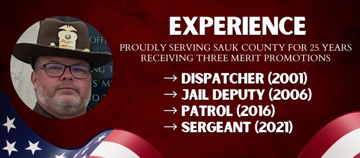 Erik Knull is a dedicated public servant who has spent his career serving and protecting the people of Sauk County. With 25 years in the Sauk County Sheriff’s Office, his experience in law enforcement, community engagement, and public service reflects his commitment to strengthening the safety and well‑being of our communities. He has a proven record of leadership, accountability, and collaboration, and he is committed to continuing this service as Sauk County Sheriff